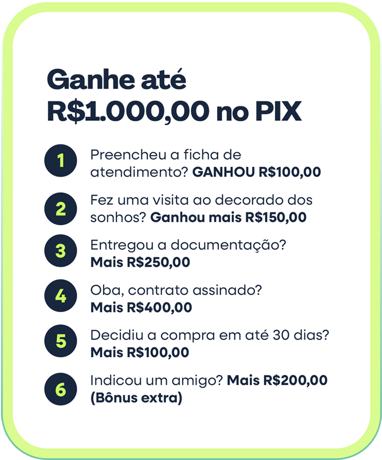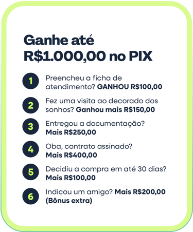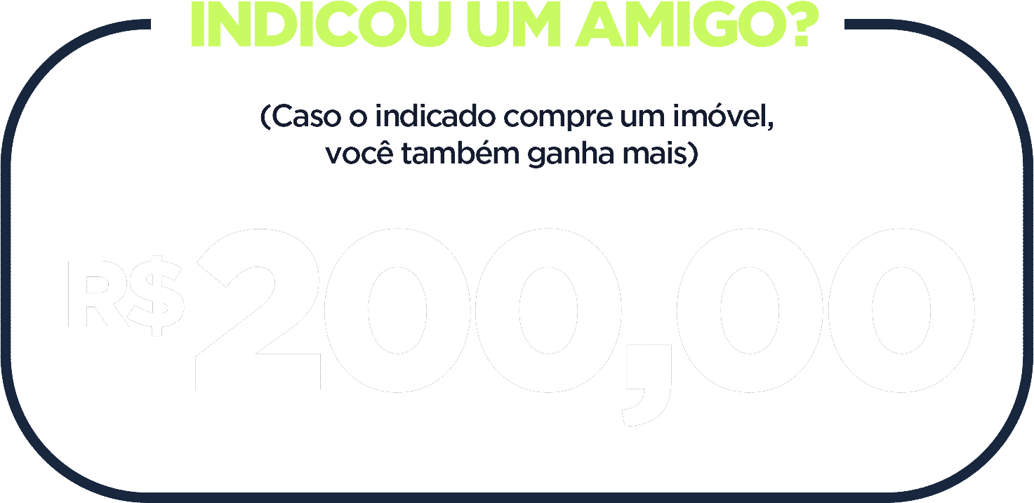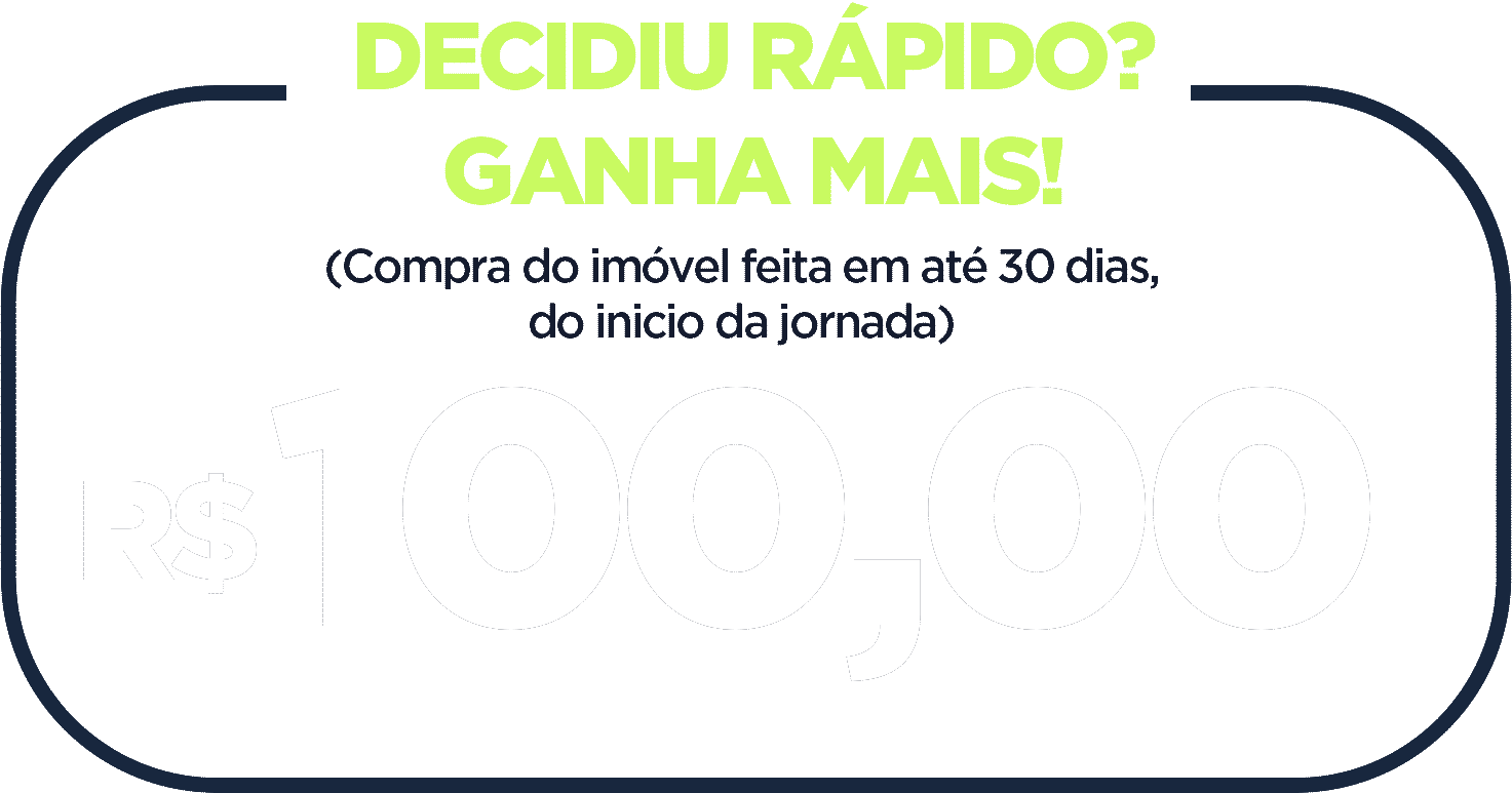 No caso de rápida decisão (compra do imóvel feita em até 30 dias, a contar da data de início da jornada), você ganha um bônus extra de R$100,00. E caso indique um amigo que compre um apê com a gente, você recebe mais R$200,00.